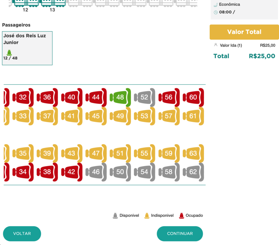 Escolha o assento de sua preferência. Note que, devido a pandemia, as cadeiras dos corredores estão bloqueadas. Após a escolha do assento, clique em continuar.