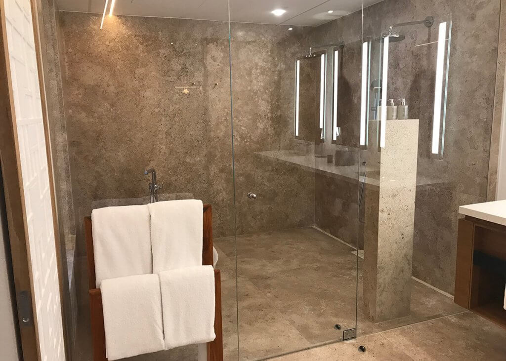 - Dois chuveiros ficam numa área com vidros transparentes. Para pessoas que não são íntimas o suficiente, essa falta de privacidade pode ser um problema.