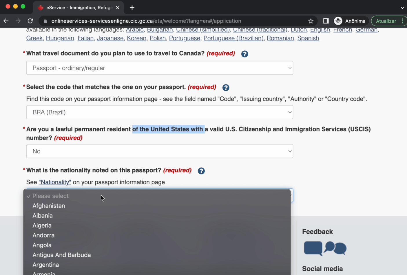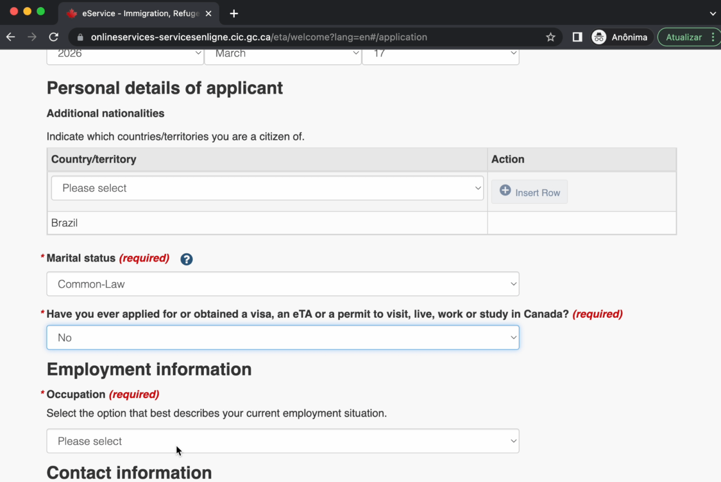 Inclua outras nacionalidades que você possui, estado civil (common-law é união estável) e informe se você já aplicou anteriormente para outra permissão eletrônica para o Candá.
