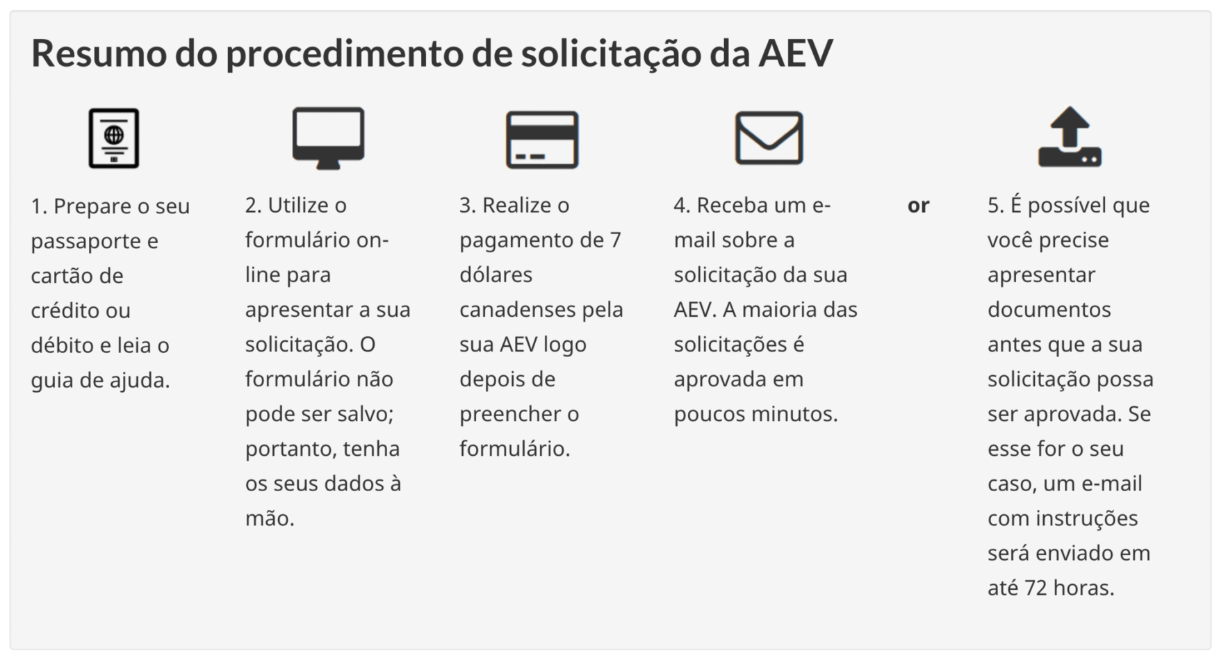 O Electronic Travel Authorization (eTA) ou Autorização Eletrônica de Viagem (AEV) é um visto canadense simplificado, feito todo através da internet. Nada mais é que um simples formulário a ser preenchido e que, na maioria das vezes, tem uma aprovação automática.